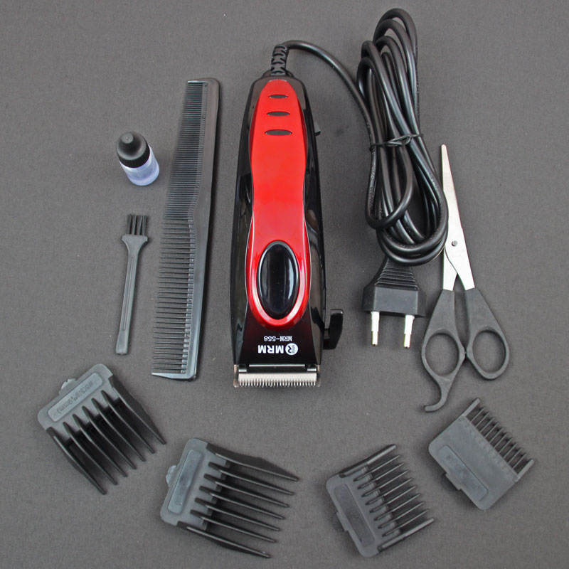 Профессиональная машинка серии MRM, работающая от сети 220В, сетевая мощность 15 Вт, регулируемый нож из нержавеющей стали, ширина ножа 45 мм. В комплекте: сменные насадки, ножницы, расческа