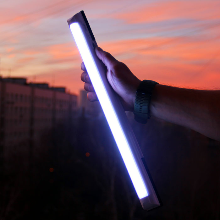 Автономный резервный светильник. Яркость 65W лампы накаливания. Работает 15 часов на половинной яркости, 9 часа на полной. Имеет встроенный аккумулятор 1100мАч