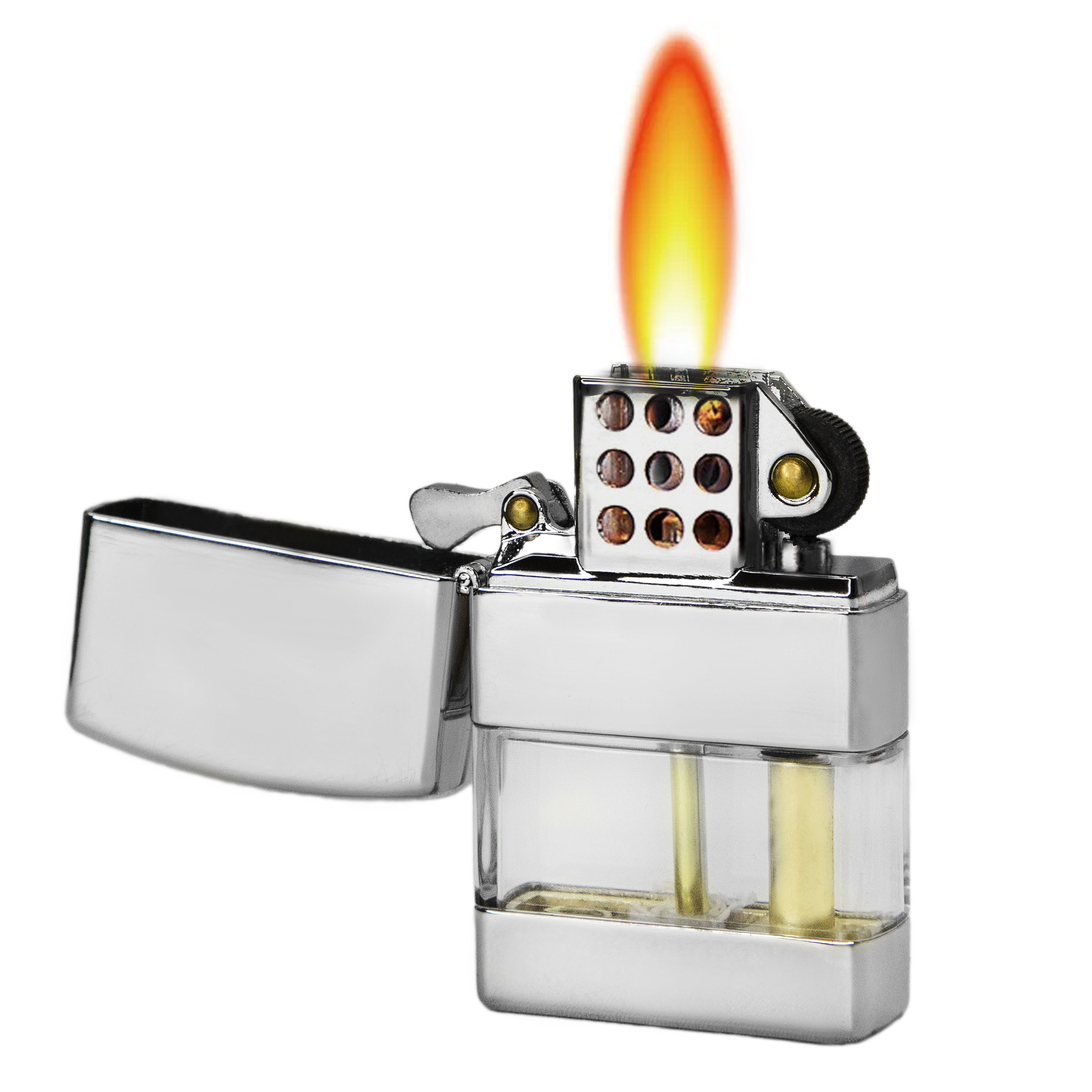 Долго держит пары бензина, не боится воды, а специальные отверстия в стенках выполняют функцию защиты огня от ветра. Зажигалка буквально всепогодная, идеально подходит для туризма и путешествий - может использоваться в полевых условиях, станет помощником в походе, на рыбалке, даче, охоте или в лесу.