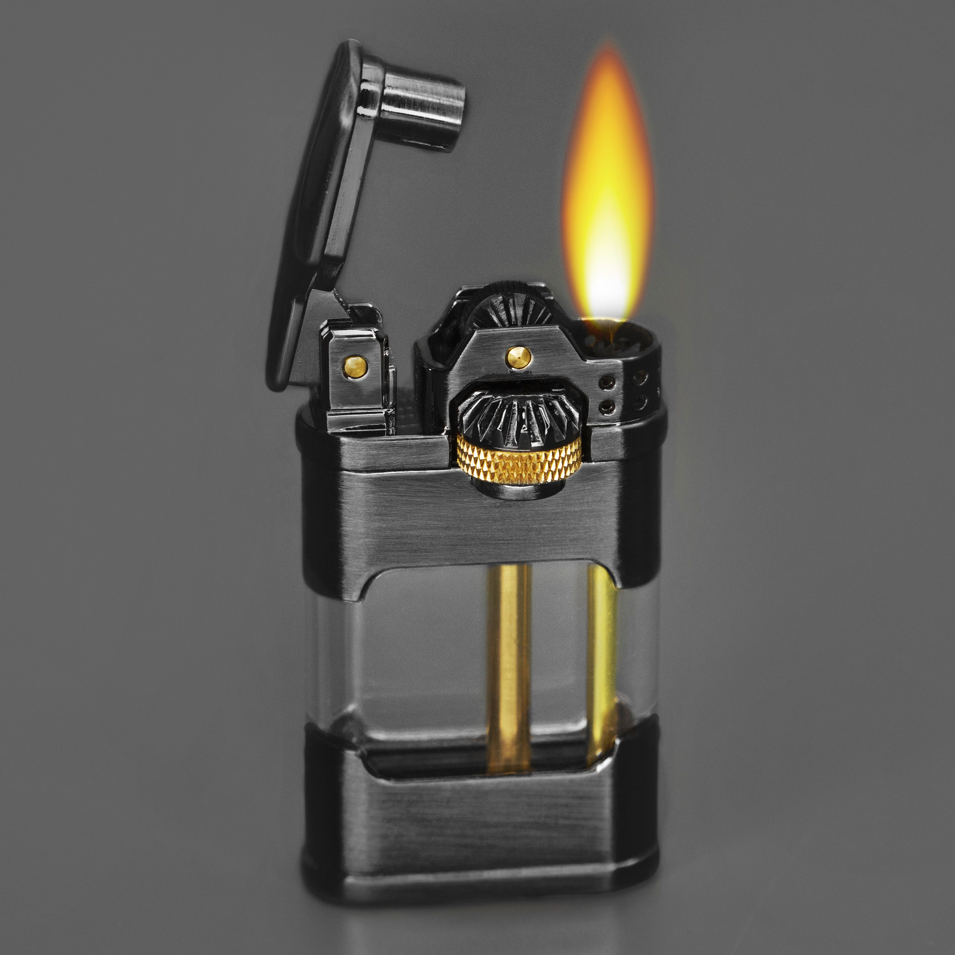 Данная зажигалка долго держит пары бензина, не боится ветра и воды, ведь вместо пропитки (ваты) для паров бензина в данном типе зажигалок используется резервуар с жидким топливом, что увеличивает время работы такой зажигалки от одной заправки в сотки раз по сравнению с обычной зажигалкой.
