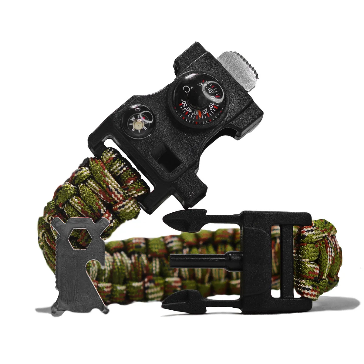 Мужской браслет из паракорда с набором для выживания. Мужской размер браслета дает возможность по надобности, переплести его для девушки. Характеристики: Длина: 23см Габариты огнива: 2х0,4см Свисток Компас-мини Клинок серрейтора 1см Термометр (Цельсий) Мультитул из высококачественной стали: мини отвертки (2 крест+2 плоские) и ключи (3шт) Паракорд 2.2м