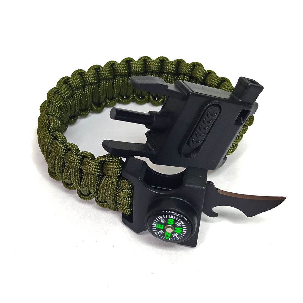 Браслет выживания с Ножом, огнивом, свистком компасом и фонарем олива