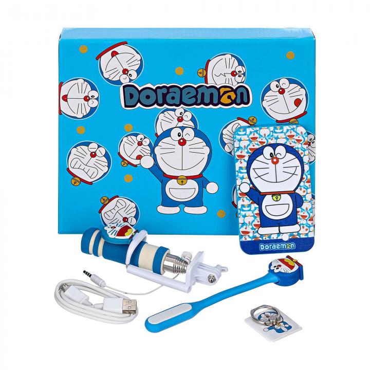 Набор Doraemon отлично подойдет для подарка ребенку. Он включает в себя несколько необходимых гаджетов для смартфона: повербанк, монопод, держатель для телефона, USB LED лампу, USB кабель.