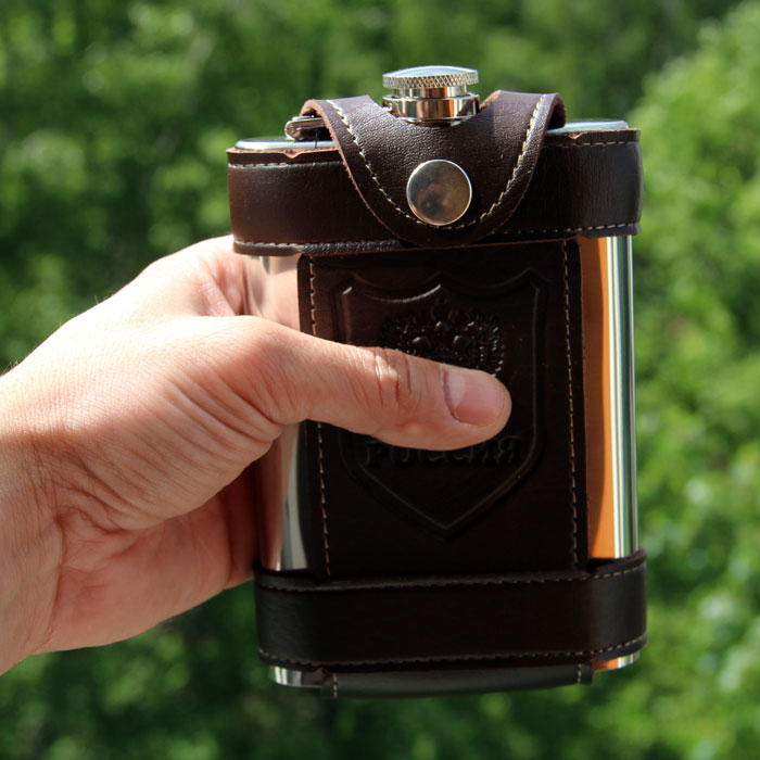 Фляга плоская, нержавеющая сталь, удобный колпачок, который не потеряется, анатомическая форма (удобно носить в заднем кармане). Прочный и функциональный чехол с петлей для ношения на ремне