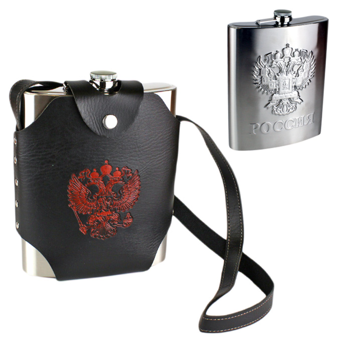 Большая фляга для настоящего патриота. Фляжка из нержавейки с гербовой символикой России в кабуре.