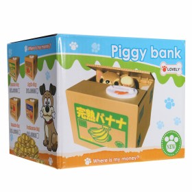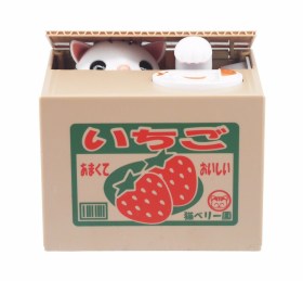 Данная копилка изготовлена в виде коробки в которой сидит питомец. После помещения монеты на специальную платформу для купюр, котик забирает её лапой, после этого он сразу спрячется.