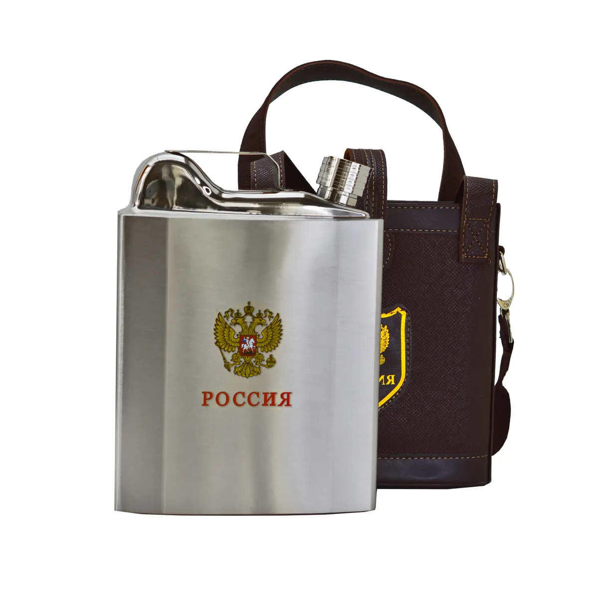 Фляжка в кожаном чехле «Россия», выполнена в виде канистры, ее оригинальность оценят все. На что стоит обратить внимание - это на ее оптимальный объем 1590 мл, благодаря которому фляжка из нержавеющей стали станет незаменимой на любом мужском празднике и отличным подарком к любому празднику для любителей истории своей страны. Чехол выполнен из качественного кожзаменителя, на который нанесен принт с изображением герба и надписи Россия. Стильный, оригинальный подарок