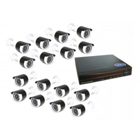 Система видеонаблюдения состоит из 16 цветных уличных камер и 16-ти канальным видеорегистратором - устройством записи с приемником. Для того, чтобы получить полностью готовую систему, нужно установить жесткий диск (объемом до 4Тб) и любой монитор или телевизор.