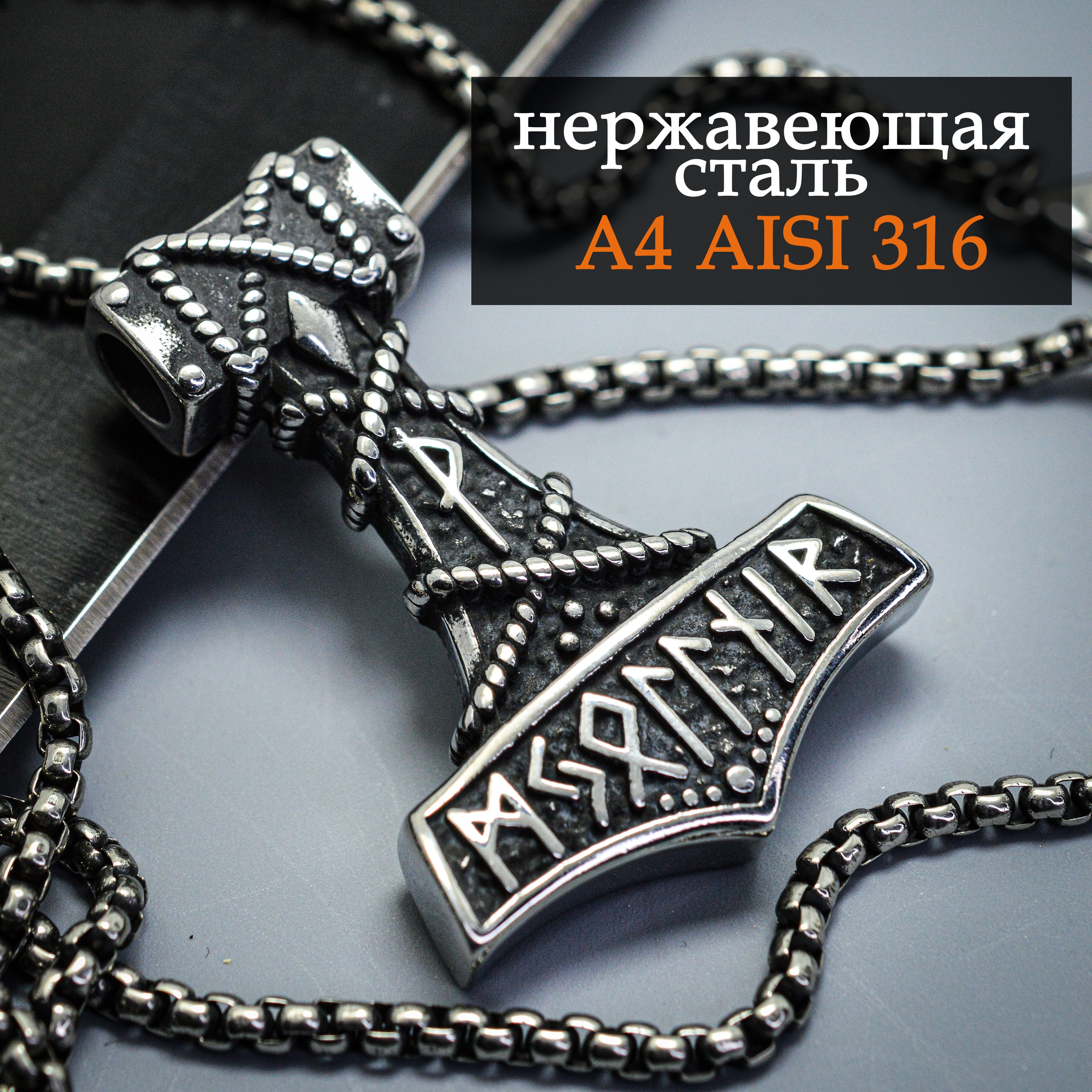 Комплект: подвеска из нержавеющей стали А4 AISI 316 и цепочка 60см / Кулон нержавейка "Молот Сварога" / Оберег славянский, амулет, талисман