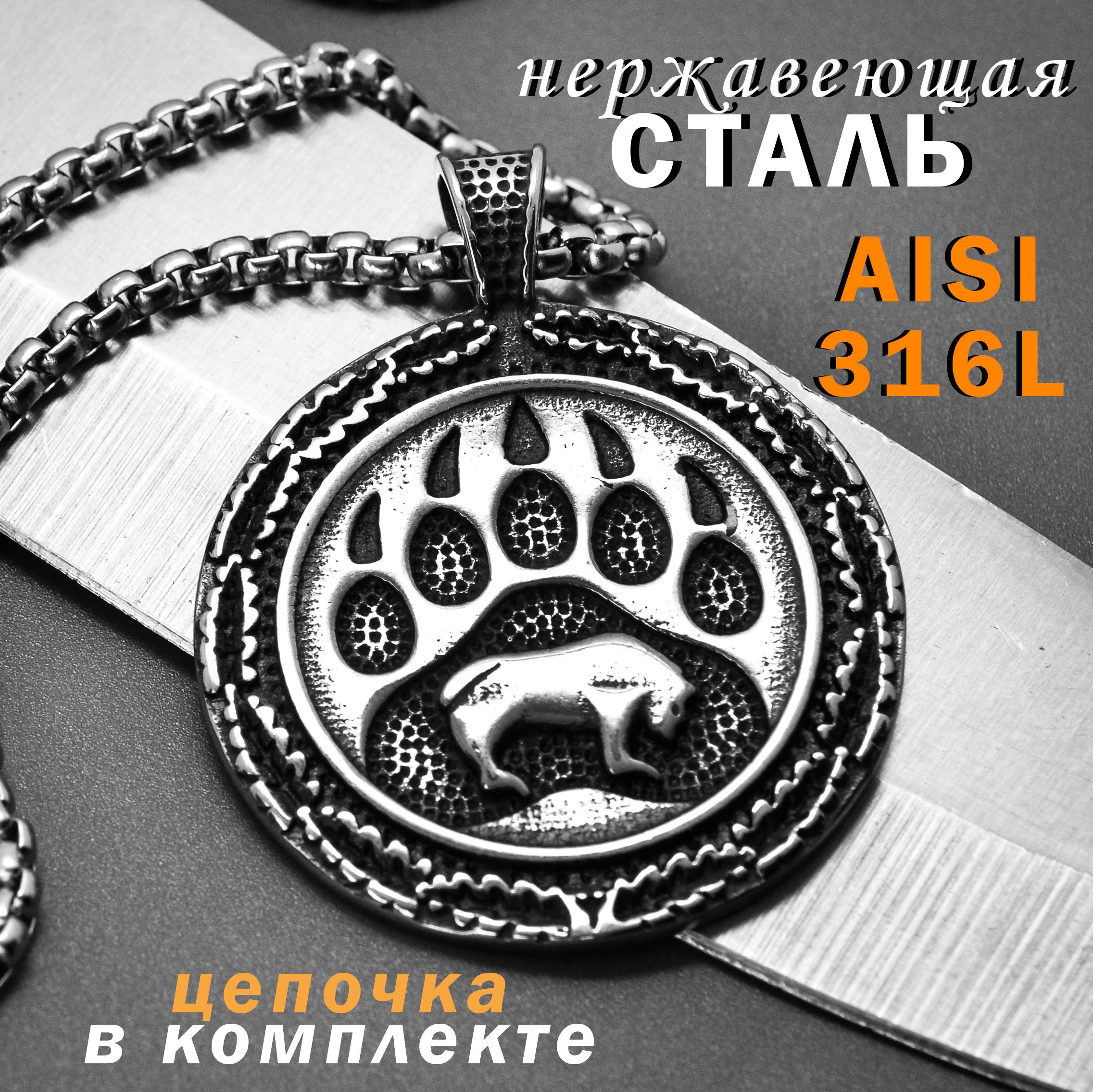 Комплект: подвеска из нержавеющей стали AISI 316L + цепочка / Кулон круглый "Медвежья Лапа" / Оберег славянский, рунический круг, топор, амулет, талисман