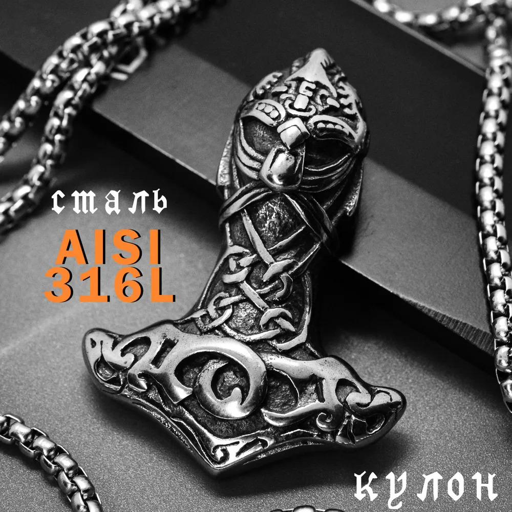 Комплект: подвеска из нержавеющей стали AISI 316L + цепочка / Кулон "Мьёльнир и шлем" / Оберег славянский, руны, викинг, амулет, талисман