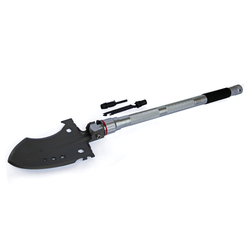 Лопата многофункциональная (топор, пила, кирка, нож) с алюминиевой рукоятью, с огнивом. Благодаря небольшим размерам не займет много места в багажнике автомобиля, кофре квадроцикла, рюкзаке. В лопате есть место для организации набора выживания в герметичной полости внутри рукояти. Нержавеющая, толстая, прочная сталь.