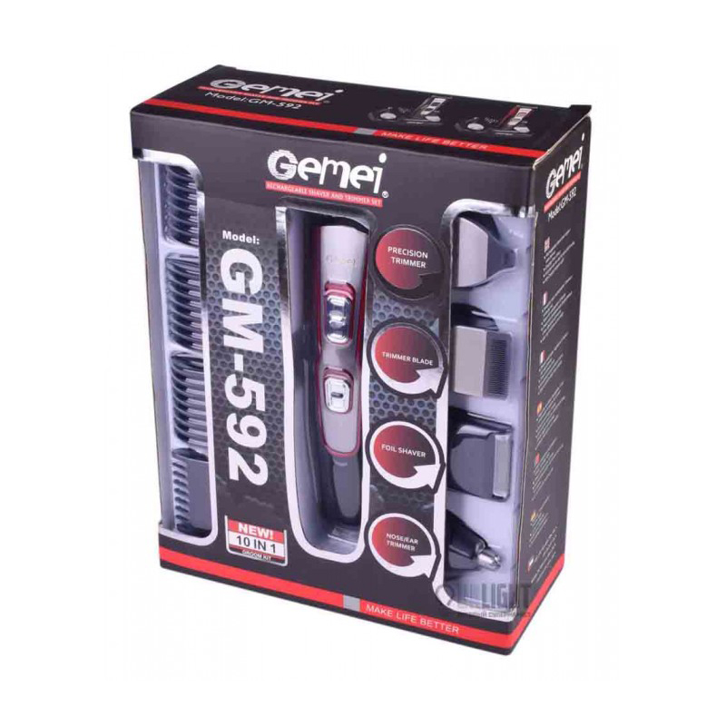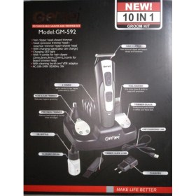 Машинка для стрижки GEMEI GM-592 беспроводная - триммер 10 в 1 отличный подарок для современного мужчины, который следит за своей внешностью и любит во всем аккуратность и организованность. На цельной подставке грамотно расположена сама машинка GEMEI GM-592 и сопутствующие ей аксессуары. Каждая из имеющихся с десяти насадок в наборе имеет свое строгое назначение, благодаря этому комплекту мужчина может поддерживать в идеальном состоянии свои усы и бороду, регулировать длину состригаемых волос, а также деликатно избавляться от лишних волос в носу и ушах.