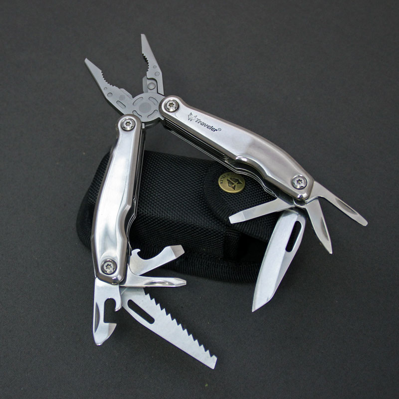 Флагман компактных мультитулов от производителя Traveler. В нём применена фирменная технология "пассатижи без пружины". Пружину заменяет новый механизм, включающий в себя гибкую пластину спрятанную в корпусе мультитула, пластина не растягивается и гораздо более надёжна - гарантия на 1000000 (1 миллион) раскрытий без потери жесткости!
