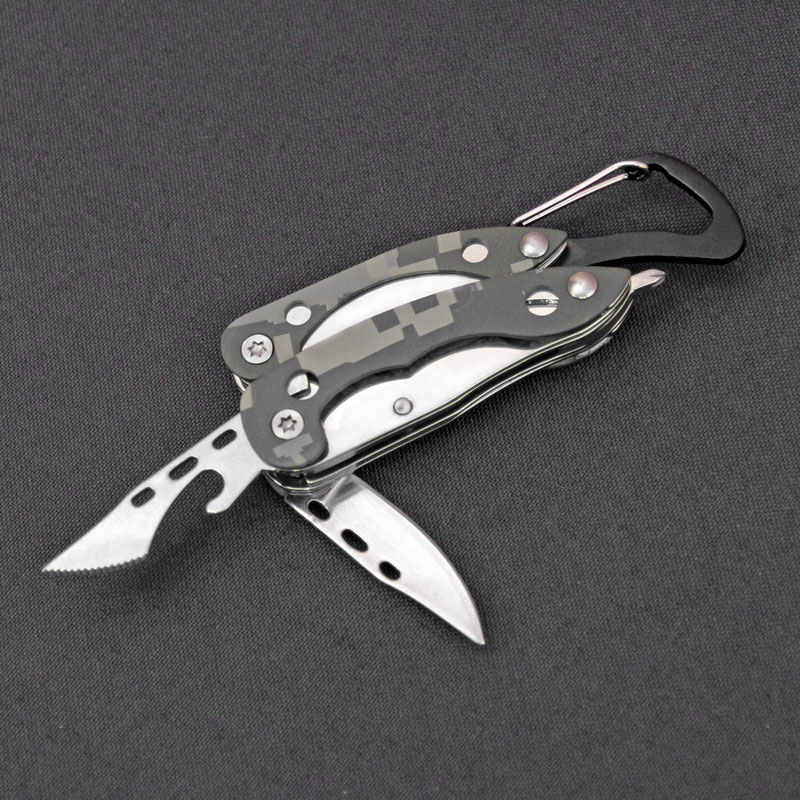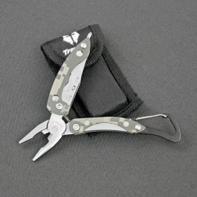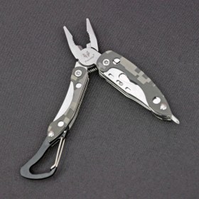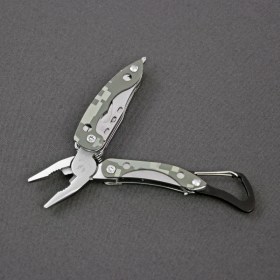 Многофункциональный нож с пассатижами и серейтерным резаком в металле. Высокое качество исполнения. Надёжный карабин для крепления.