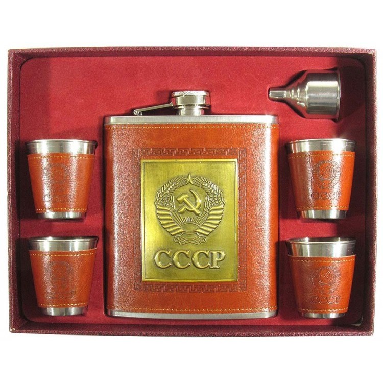 Подарочный набор СССР включает в себя шесть предметов: флягу в кожаном чехле, четыре стопки в кожаных чехольчиках и металлическую воронку. С помощью такого набора вы легко сможете провести собрание парт-актива или пленарное заседание обкома. Каждый элемент в наборе выполнен из пищевой нержавеющей стали и украшен гербом СССР. Такой набор станет отличным подарком для хорошего друга или коллеги по работе, для того кто испытывает ностальгию по утраченной империи и своему советскому детству.