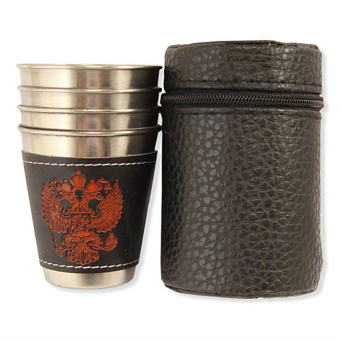 Подарочный набор из 4-х малых стопок в футляре с изображением Герба станет приятным сувениром товарищу по службе, близкому другу, любимому мужчине на 23 февраля или к любому другому празднику!