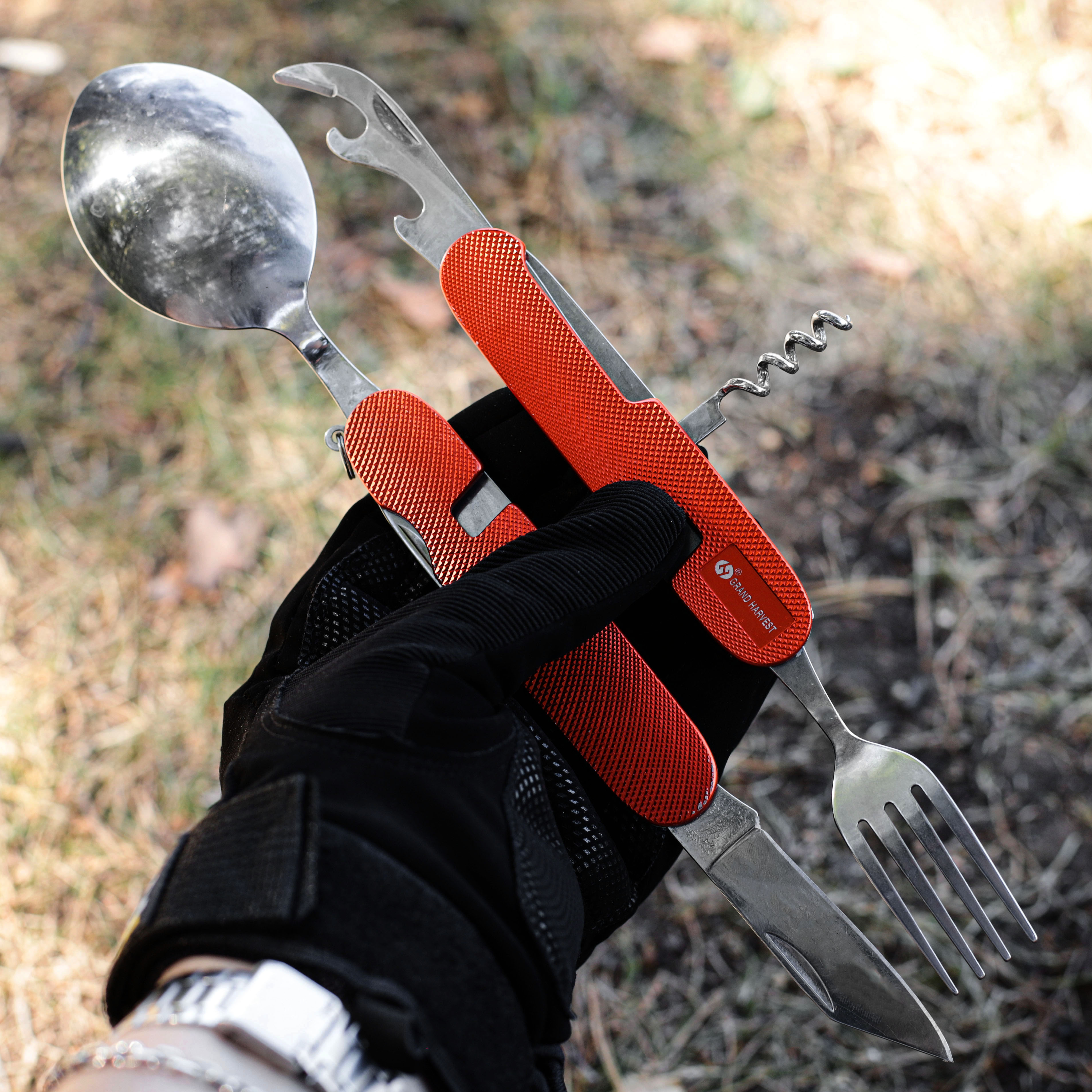 Набор столовых приборов очень компактный и легкий - он не занимает много места. Надежные встроенные фиксаторы обеспечивают быстрое открытие и складывание набора. А нержавеющая сталь обеспечит антикоррозийное свойство на всех приборах. Благодаря рифленой поверхности ручек, прибор очень удобно и комфортно держать в руке.