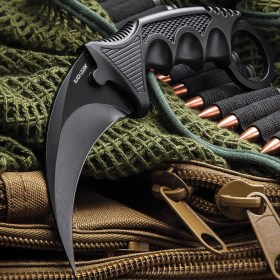 Средний керамбит (karambit) носит универсальное назначение и применяется в туристической среде, охотниками и рыболовами. Его притягательная эстетика необъяснима, скорее всего, мы чувствуем в нем, самый мощный природный аналог - коготь зверя. В комплекте идут ножны из пластика со шнурком, позволяющим носить нож на шее.