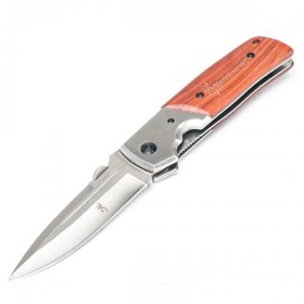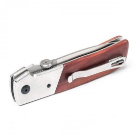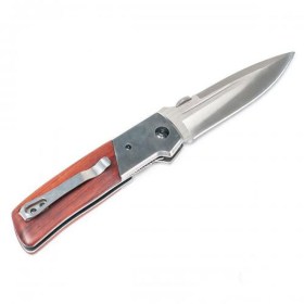 Сделан из высококачественной фабричной 420-ой стали в серебристой расцветке. Рукоятка идет частично из металла и частично из деревянных накладок. На ней расположена клипса – специальное крепление, которое может цепляться за край одежды, кармана, рюкзака и т.п. Также на конце рукоятки есть отверстие под темляк. Открывается нож при помощи шпеньков.