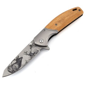 На клинке нанесен декоративный рисунок.Комбинированная рукоять из металла и светлого дерева;Клипса для крепления ножа на кармане одежды, рюкзака или сумки;Складной нож оснащен замком по принципу работы Liner-Lock.В рукоятке расположено отверстие, которое можно использовать под темляк.