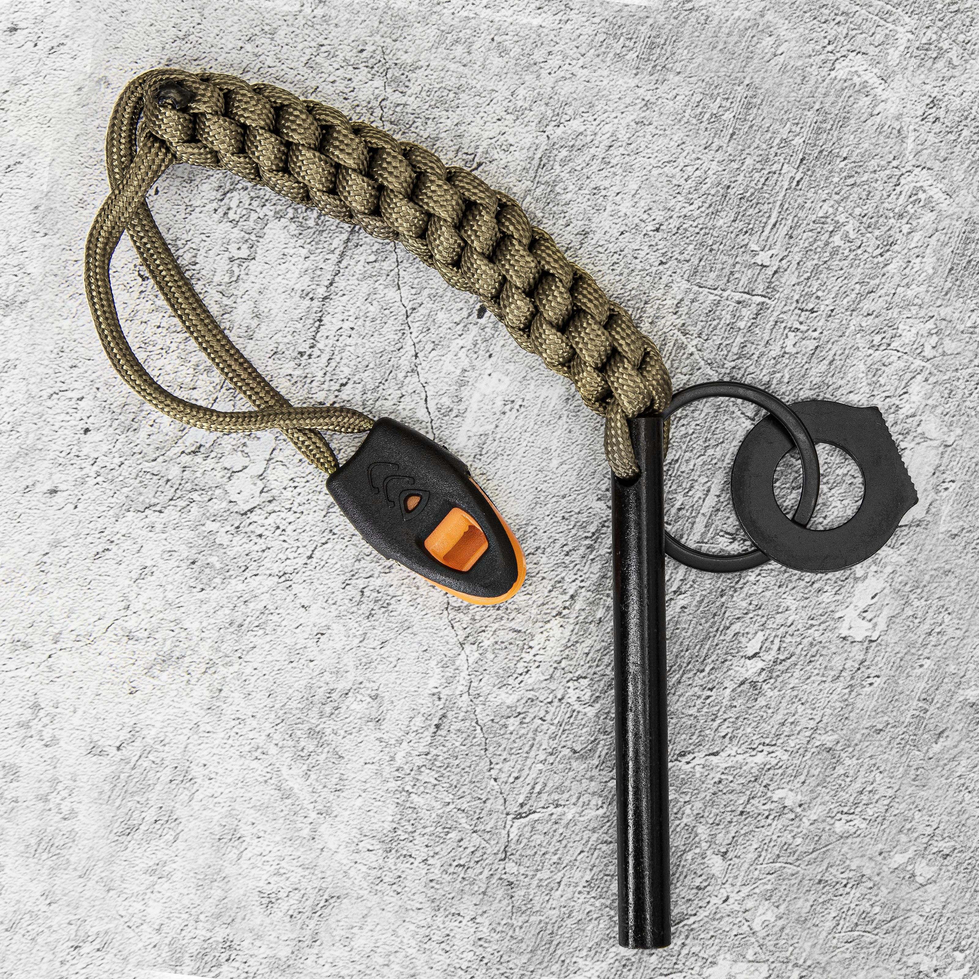 Стержень огнива выполнен из кремния, в паре с кресалом из нержавеющей стали, обеспечивающее лёгкое высечение искр. В комплекте так же идёт паракорд и свисток.