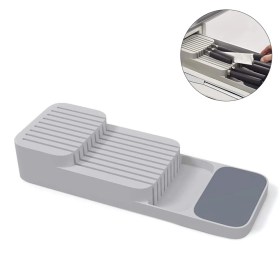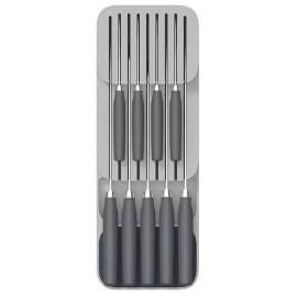 Органайзер рассчитан на количество до 9-ти ножей. На дне есть силиконовые ножки, которые обеспечивают плотное сцепление с любой поверхностью. Он занимает гораздо меньше места, чем обычные модели такого типа, и открывает новые возможности по организации пространства для хранения кухонной утвари.