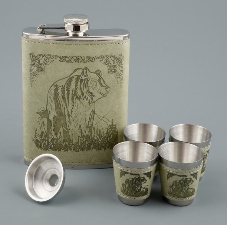 Фляжка и стопки изготовлены из нержавеющей стали и покрыты искусственной кожей.
