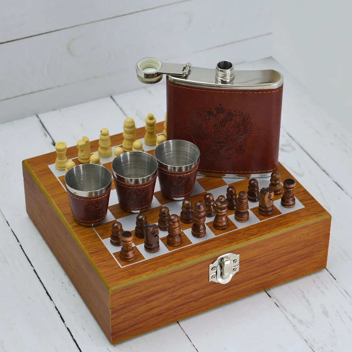 Походные и подарочные шахматы, фляга и 3 стаканчика в чемодане. Фигурки дерево, размер поля 20х20 см.