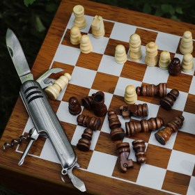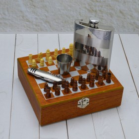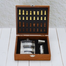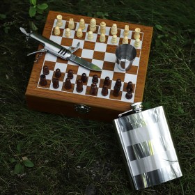 Походные и подарочные шахматы, фляга, стаканчик и мультитул в чемодане. Фигурки дерево, размер поля 20х20 см.
