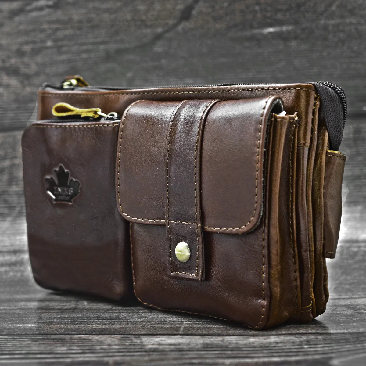 Прочная сумка кошелек из натуральной кожи для ношения на поясе. Имеет множество карманов на молнии для грамотного распределения пространства.