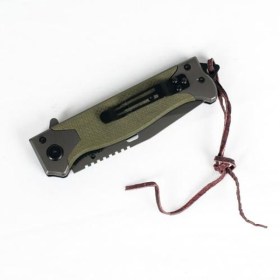 Выполнен из высококачественной фабричной стали марки 420. Рукоять сделана из пластиковых накладок G10. Они имеют рифленую поверхность, которая уменьшает скольжение ладони, тем самым более надежно фиксируют вашу руку. На обухе есть специальные насечки для большого пальца, они помогают при мелких работах с ножом (например, что-то подстрогать). Данная модель оснащена съемной клипсой – специальным креплением, которое цепляется за край одежды, сумки, рюкзака и т.п. На тыльной части рукоятки интегрирован стеклобой, он может выручить в случаи чрезвычайной ситуации.