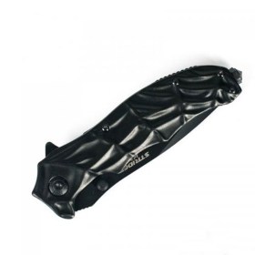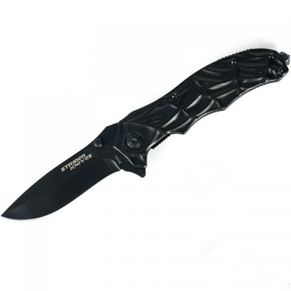 Произведен из высококачественной фабричной стали марки 420 в черном цвете. Рукоять имеет декоративный узор в виде паутины, который также создает рифленую поверхность, уменьшающую скольжение вашей руки. В рукоятку интегрирован дополнительный небольшой скрытый резак, он открывается при помощи шпенька. На тыльной части рукоятки идет стеклобой, который может выручить в случаи аварийной ситуации. Для открытия используют либо рычаг-плавник, либо специальные шпеньки.