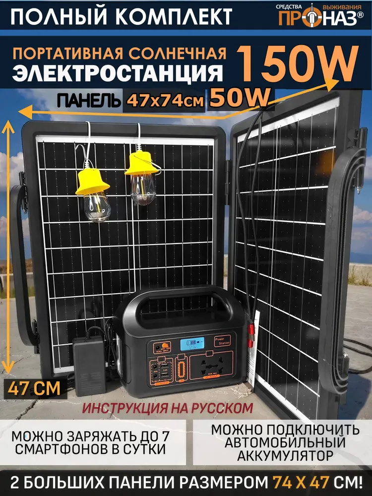 Компактная электростанция на солнечной энергии для работы приборов (220В до 150Вт) и зарядки различных портативных устройств, обеспечения освещением при ЧС, во время походов, в зоне боевых действий и других условий без электричества.