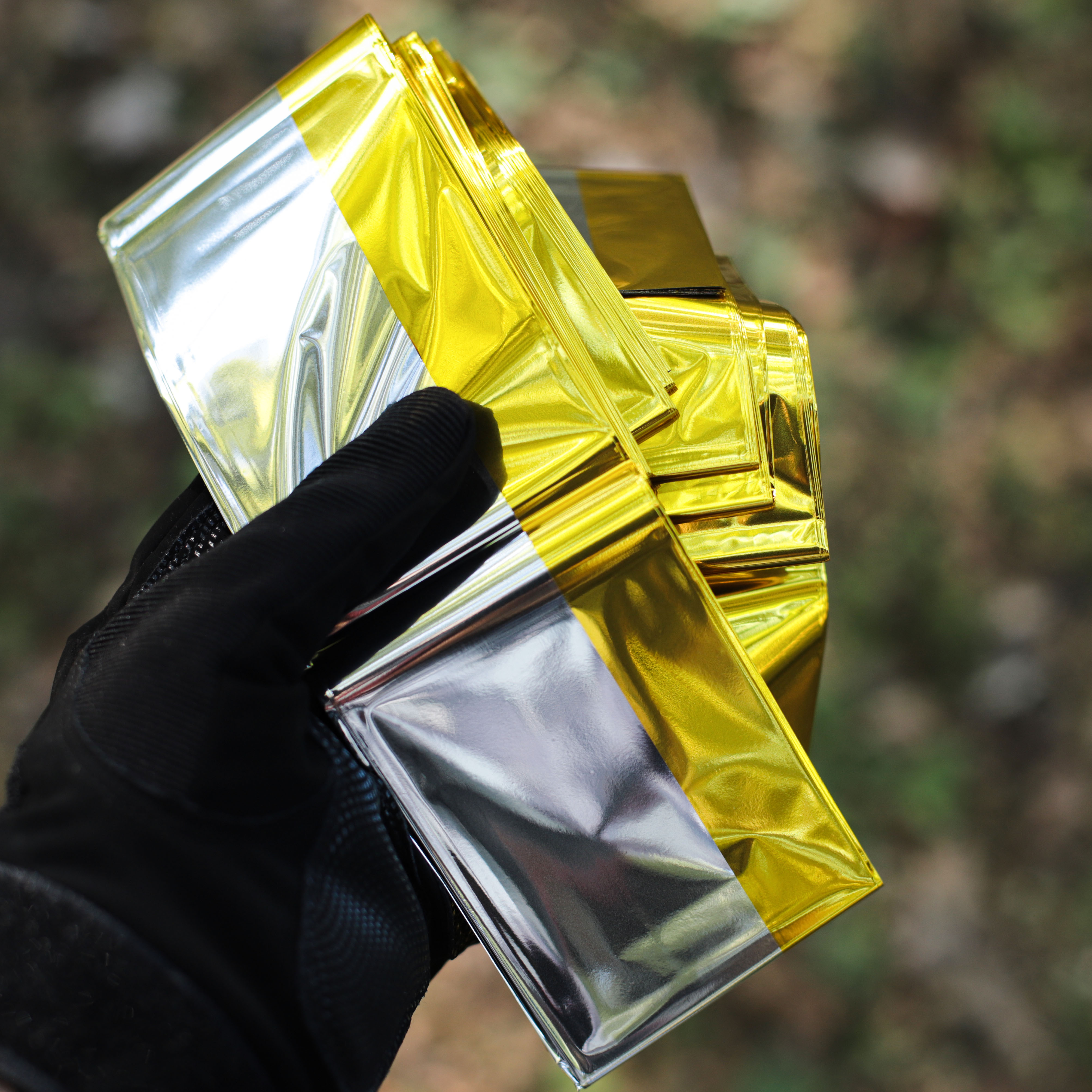 Алюминиевое одеяло, покрытое защитной пленкой. Предохраняет от жары, холода, солнца, осадков (в том числе и радиоактивных). Держит до 80% тепла человеческого тела! В сложенном виде помещается в ладони!