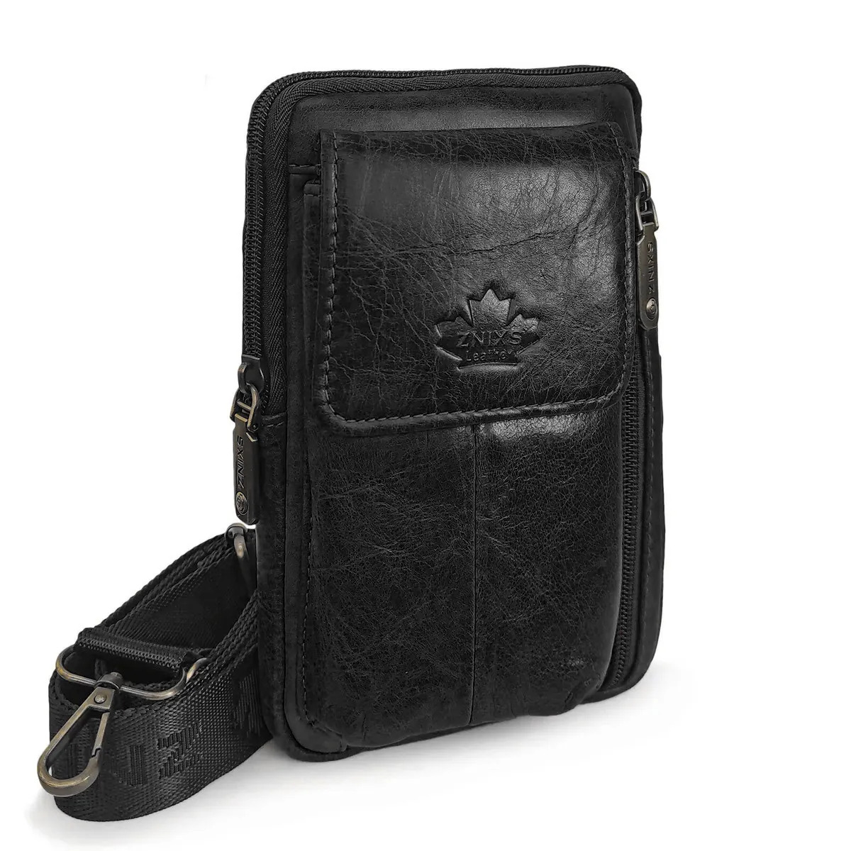 Сумка органайзер на пояс и через плечо, для кошелька, документов и телефона. Натуральная кожа, карабин, ремень Znixs 25018 черный