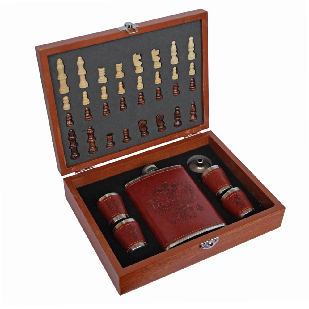 Красивый мужской подарочный набор: Шахматы, (можно играть в шашки) и фляжный набор.