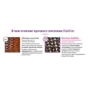 Японские колготки Elaslim выполнены в новейшей технологии узловатого плетения в пятиугольнике. Его трудно воссоздать, так как для такого плетения японцы разработали специальные станки. А вместо капроновой нити используется армированная на основе эластомерной нити с добавлением нейлона, которая отличается сверхпрочностью, блеском и растяжимостью во всех плоскостях!