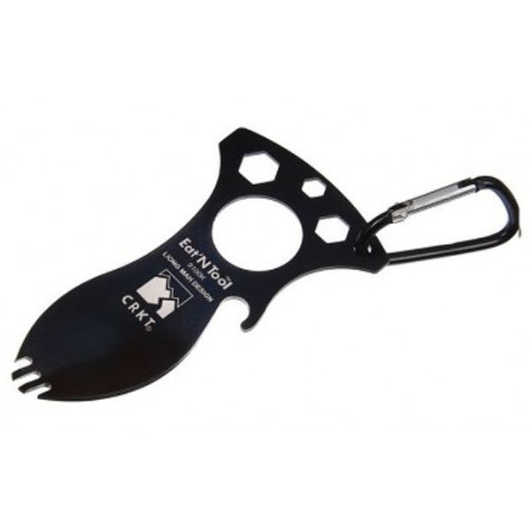 Универсальный инструмент с набором функций: ложка, вилка, открывалка для бутылок, гаечный ключ 10 мм, гаечный ключ 8 мм, гаечный ключ 6 мм, отвертка, карабин для крепления на ключи.