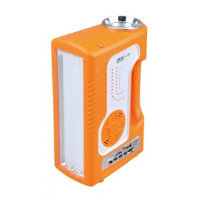Основным отличием модели является наличие светодиодной панели и фонарика с торца аккумуляторного блока. Что позволяет использовать его как самостоятельный фонарь. Еще одно преимущество - индикаторы по которых можно определить насколько разряжен аккумулятор. Зарядить разряженный встроенный аккумулятор системы можно 2-умя способами: от сети 220В или от солнечной батареи.