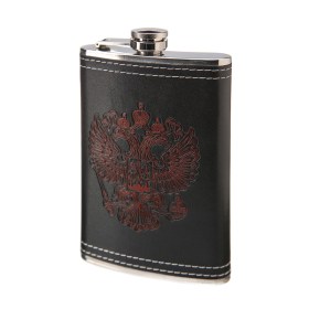 Оригинальная черная фляжка объемом 540 мл в чехле из заменителя кожи украшена гербом России, и отлично подойдет в качестве презента истинному патриоту своей державы! Фляга изготовлена из пищевой нержавеющей стали и подходит для всех видов напитков.