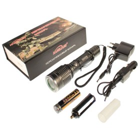 Фонарь работает с перезаряжаемым аккумулятором 18650 либо с тремя батарейками ААА. Корпус фонаря выполнен из прочного металлического сплава, надежно противостоя внешним повреждениям.