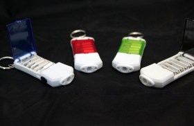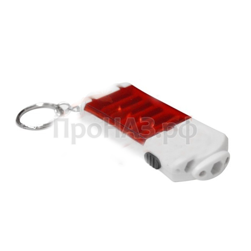 Питательными элементами выступают 4 батарейки LR44 (поставляются в комплекте). Под крышечкой на корпусе находится миниатюрный набор отверток. Конструкция изготовлена из ударопрочного пластика с высоким уровнем влаго- и пылезащиты. Металлическое кольцо прикреплено к изделию цепочкой. С его помощью фонарь фиксируют на разных предметах и одежде.