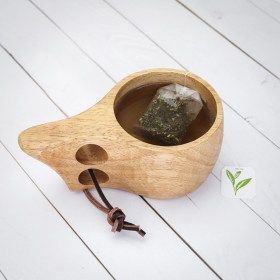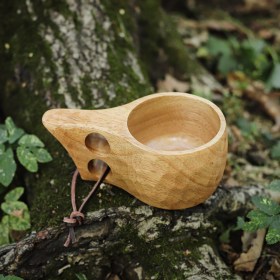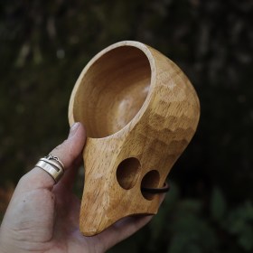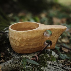 Кружка деревянная «Кукса» с двумя отверстиями на ручке выточена из цельного куска каучукового дерева. Маленькое отверстие на ручке сделано для того, чтобы подвязать кружку к поясу. Снаружи покрыта пищевым лаком. Её удобно брать в руки благодаря двум большим прорезям.