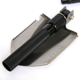 Лопата многофункциональная (топор, пила, кирка, нож) с огнивом благодаря небольшим размерам не займет много места в багажнике автомобиля, кофре квадроцикла, рюкзаке. В лопате есть место для организации набора выживания в герметичной полости внутри рукояти. Нержавеющая, толстая, прочная сталь.