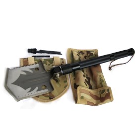 Лопата многофункциональная (топор, пила, кирка, нож) с огнивом благодаря небольшим размерам не займет много места в багажнике автомобиля, кофре квадроцикла, рюкзаке. В лопате есть место для организации набора выживания в герметичной полости внутри рукояти. Нержавеющая, толстая, прочная сталь.