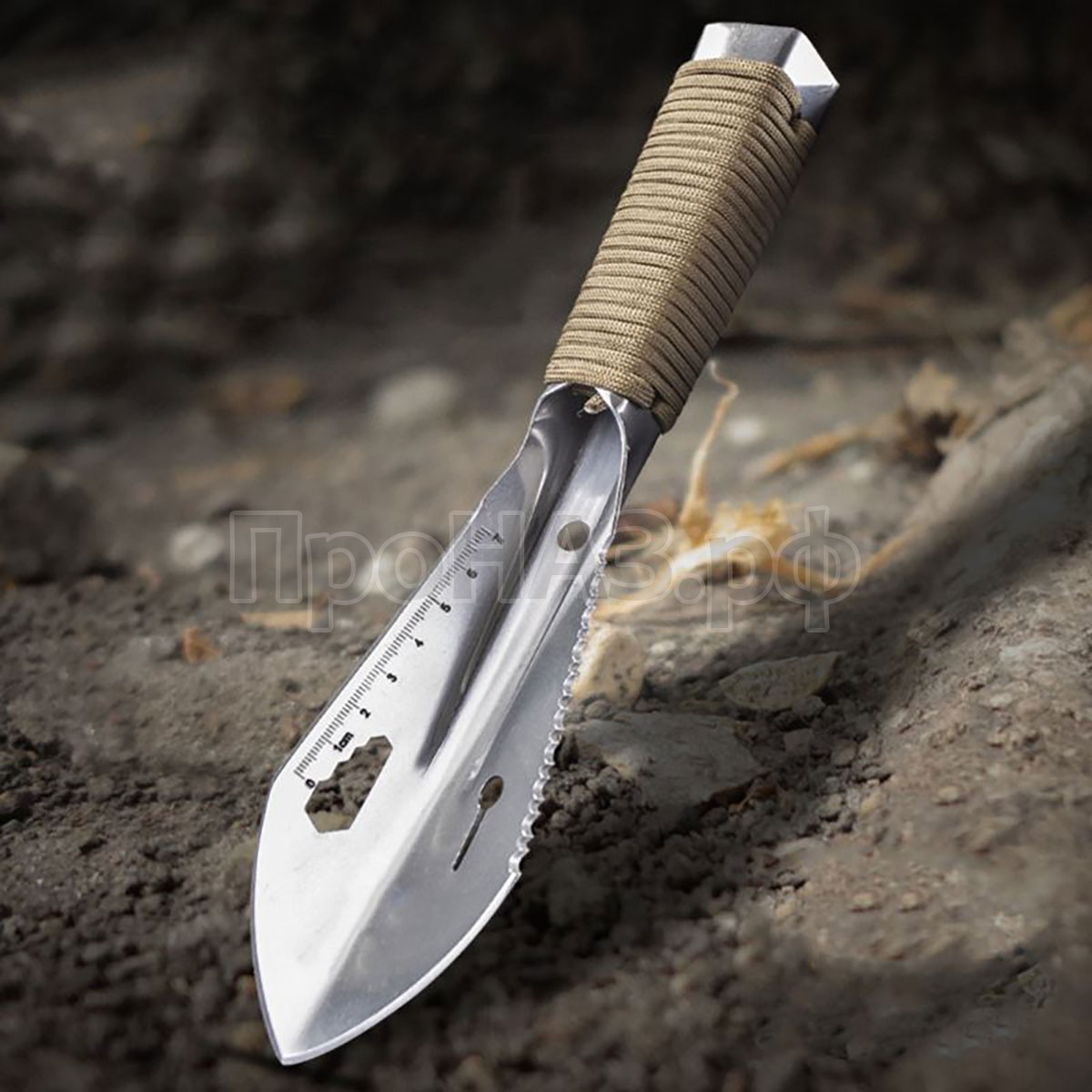Лопата многофункциональная (топор, пила, кирка, нож) с огнивом благодаря небольшим размерам не займет много места в багажнике автомобиля, кофре квадроцикла, рюкзаке. В лопате есть место для организации набора выживания в герметичной полости внутри рукояти. Нержавеющая, толстая, прочная сталь.