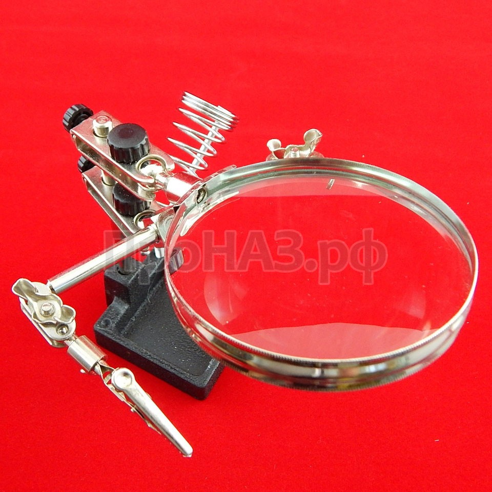 Размещение платы можно регулировать в трех плоскостях. Основание сделано из чугуна. На нем размещен держатель паяльника. Так же в основании есть выемка под губку для очистки жал.