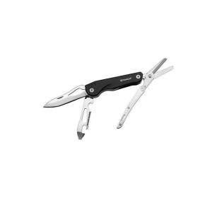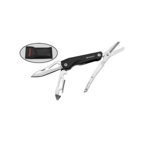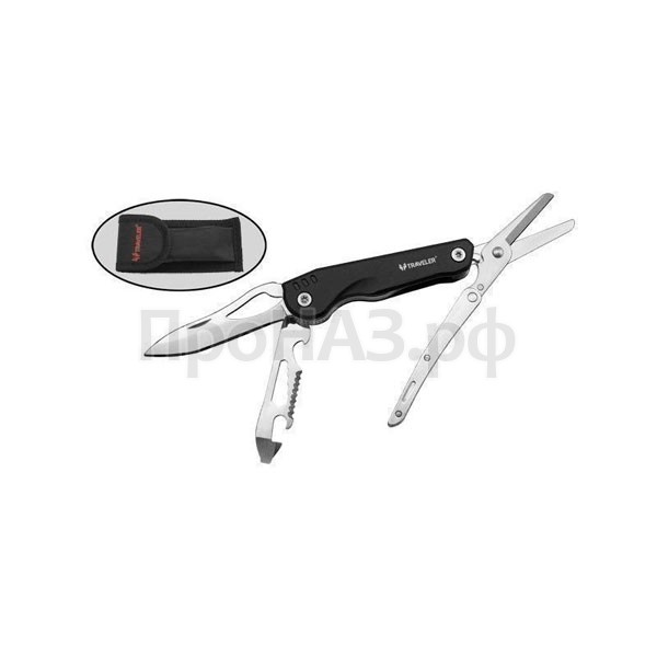 Оригинальный и практичный мультитул с ножницами. Длина в раскрытом виде 182 мм, длина клинка 77 мм. Клинок выполнен из нержавеющей стали. В набор также входят небольшая пила, шлицевая отвертка, консервный нож, открывалка для бутылок и гаечный ключ. Рукоять металлическая, с защитным покрытием. Нож поставляется в чехле из нейлона и картонной коробке.