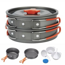 Набор походной посуды из анодированного алюминия, состоящий из кастрюли с крышкой и сковороды, позволяет соединить в себе приготовление еды и напитков.